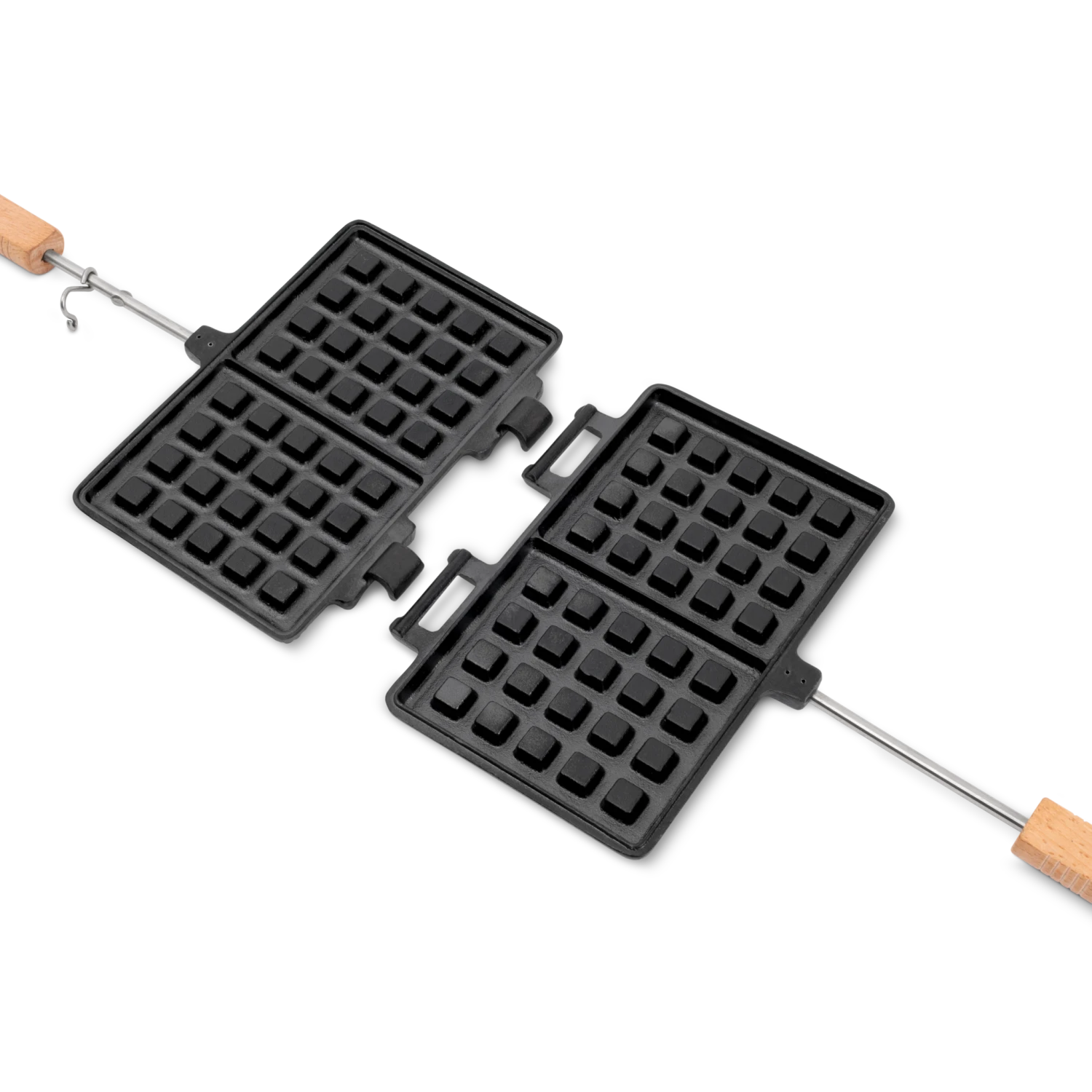 De houten handvatten passen comfortabel in de hand en de lange staaf zorgt voor de afstand tot de warmtebron. De gietvorm kan onmiddellijk worden gebruikt, deze is voorzien van een zogenaamde geseasoned afwerking. Voor het reinigen scheidt u eenvoudig de gietijzeren helften dankzij het scharnier. Overigens geniet u tijdens het reinigen van de geweldige eigenschappen van gietijzer, het heeft een natuurlijk antikleef effect.