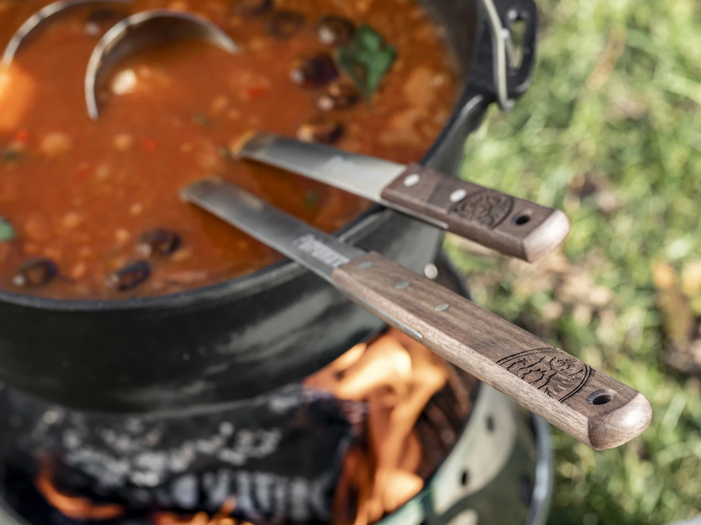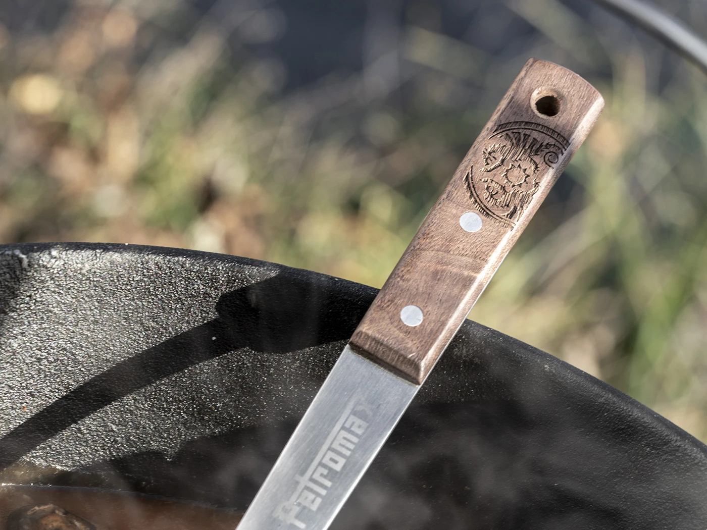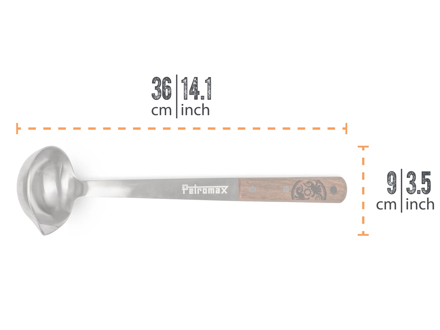 De hoogwaardige Petromax pollepel met walnoothouten heft is verkrijgbaar in de lengtes 30 cm en 50 cm.